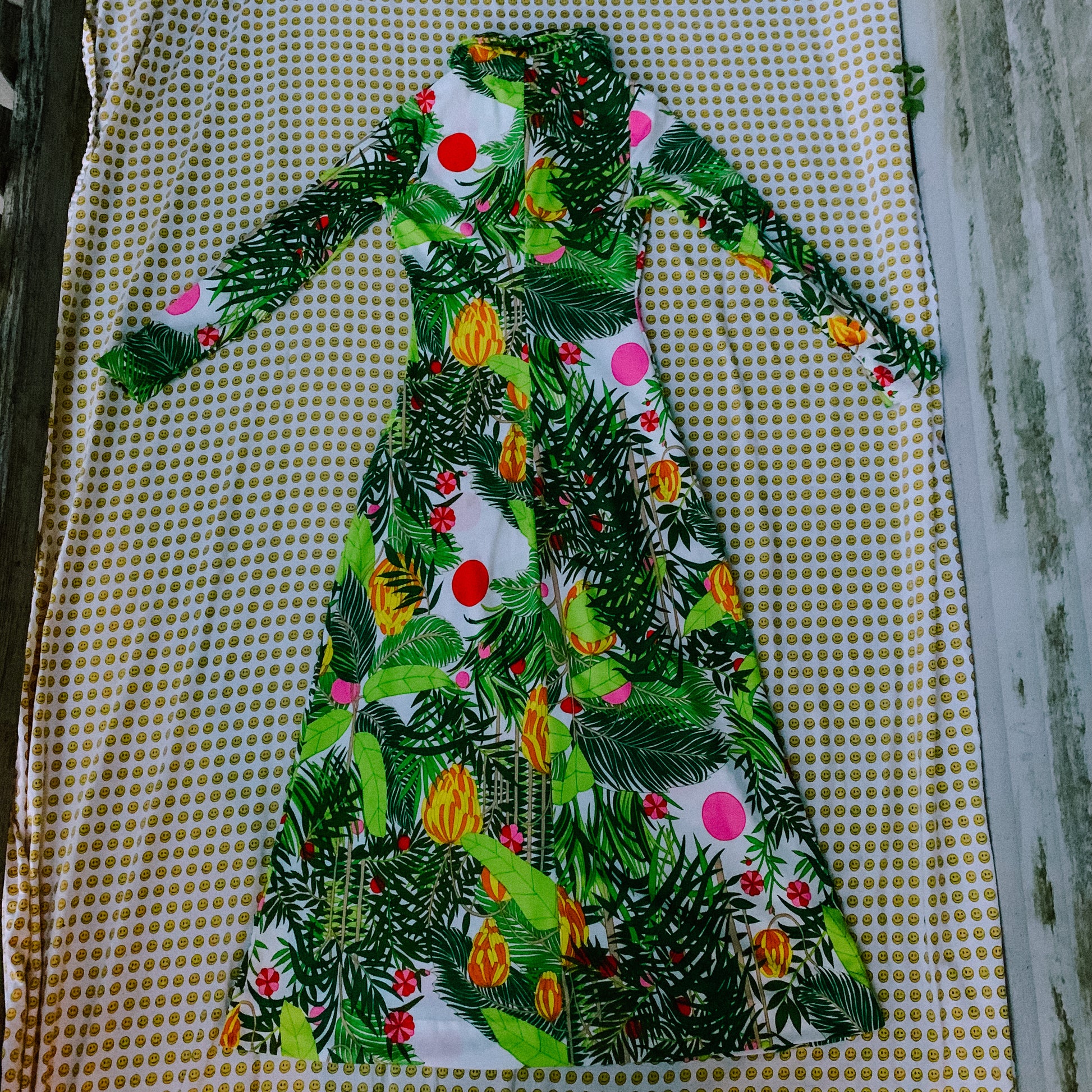 dress has some slight wear and tear and one of the sleeves will need to be reinforced in the future, but this dress is a tropical psychedelic DREAM and price reflects
