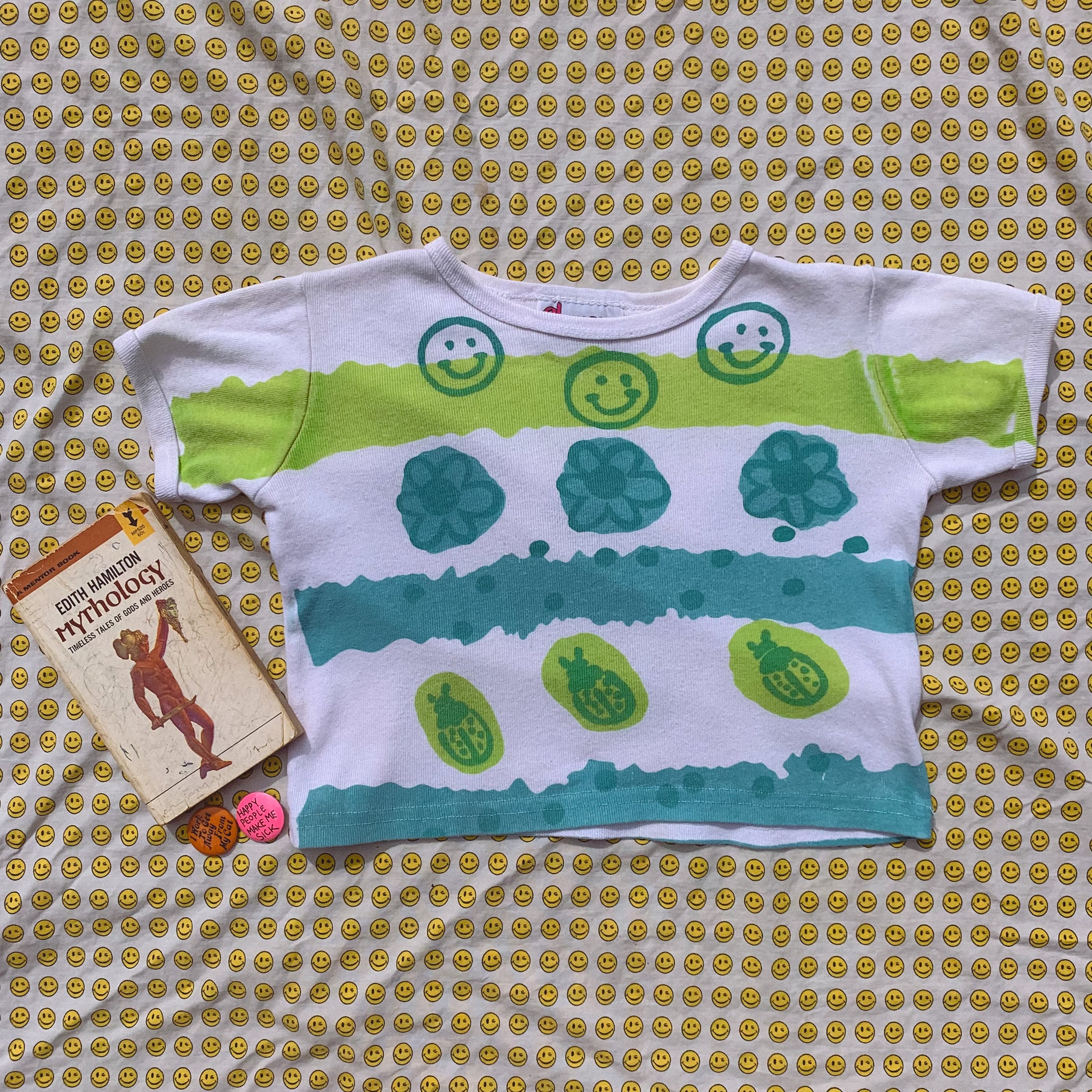 90s, green and blue t with smiley faces, a top so crop that it’s wider than it is long